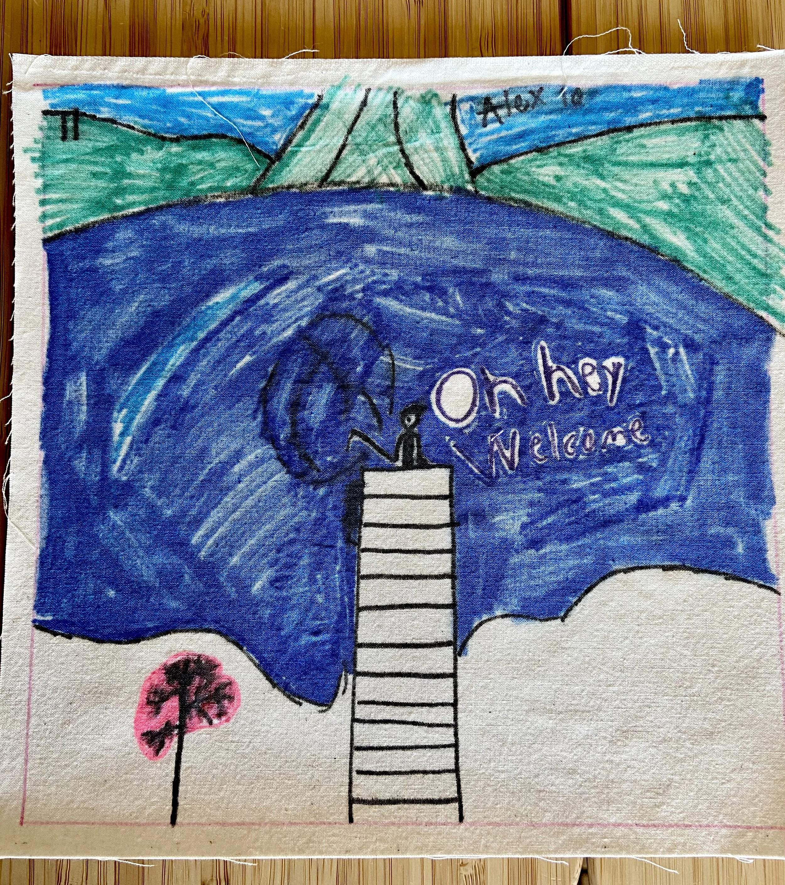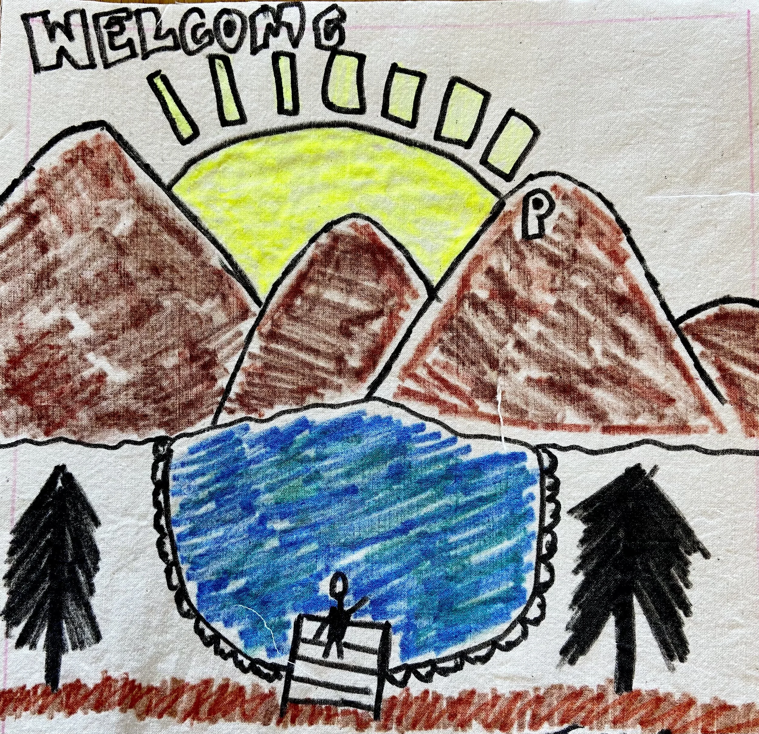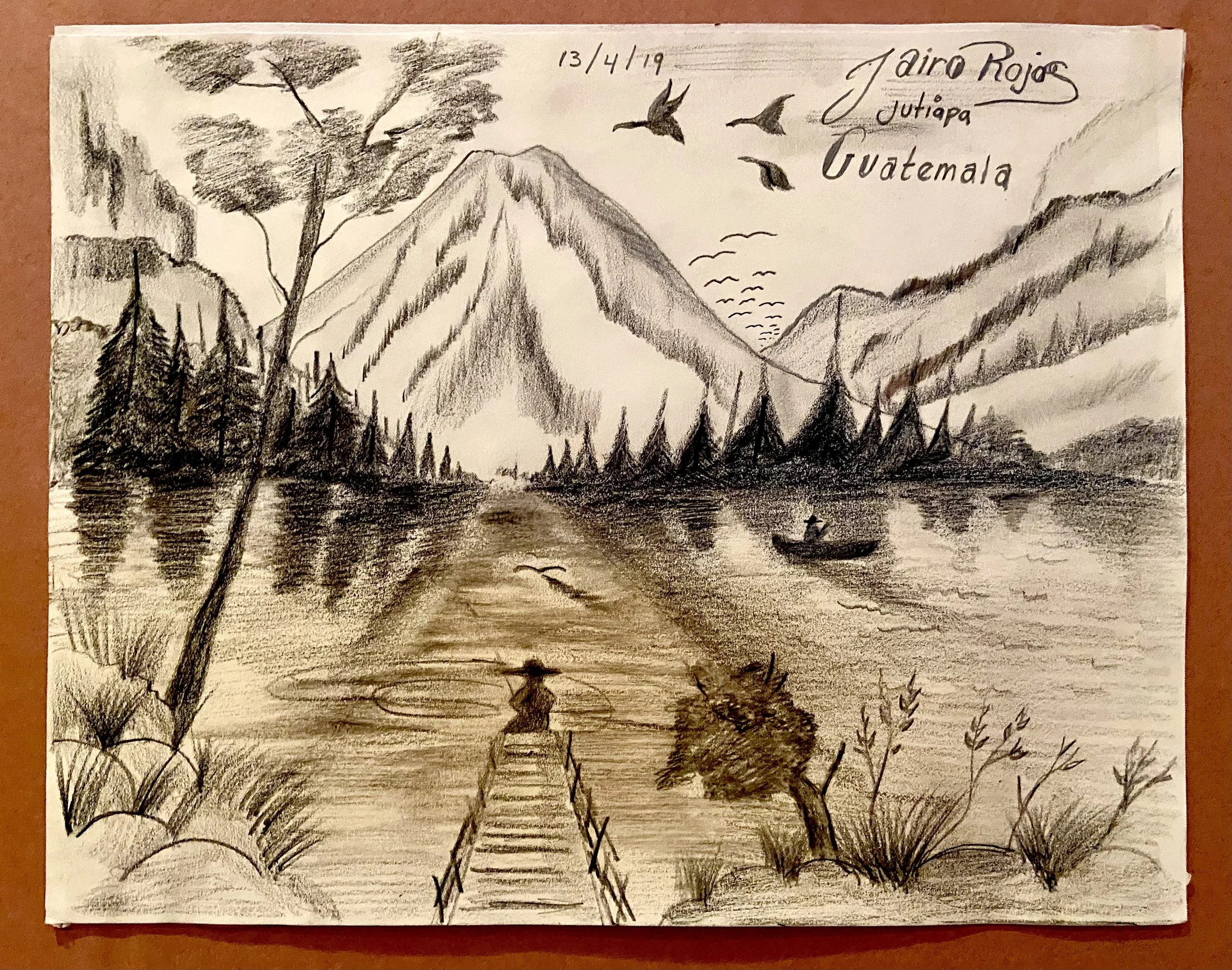 The Welcome Square drawings on the left made by 2 students in Patagonia, highlighted their love of a fishing lake surrounded by mountains that they shared with the teenager from Guatemala. The drawings make the connection visible.
