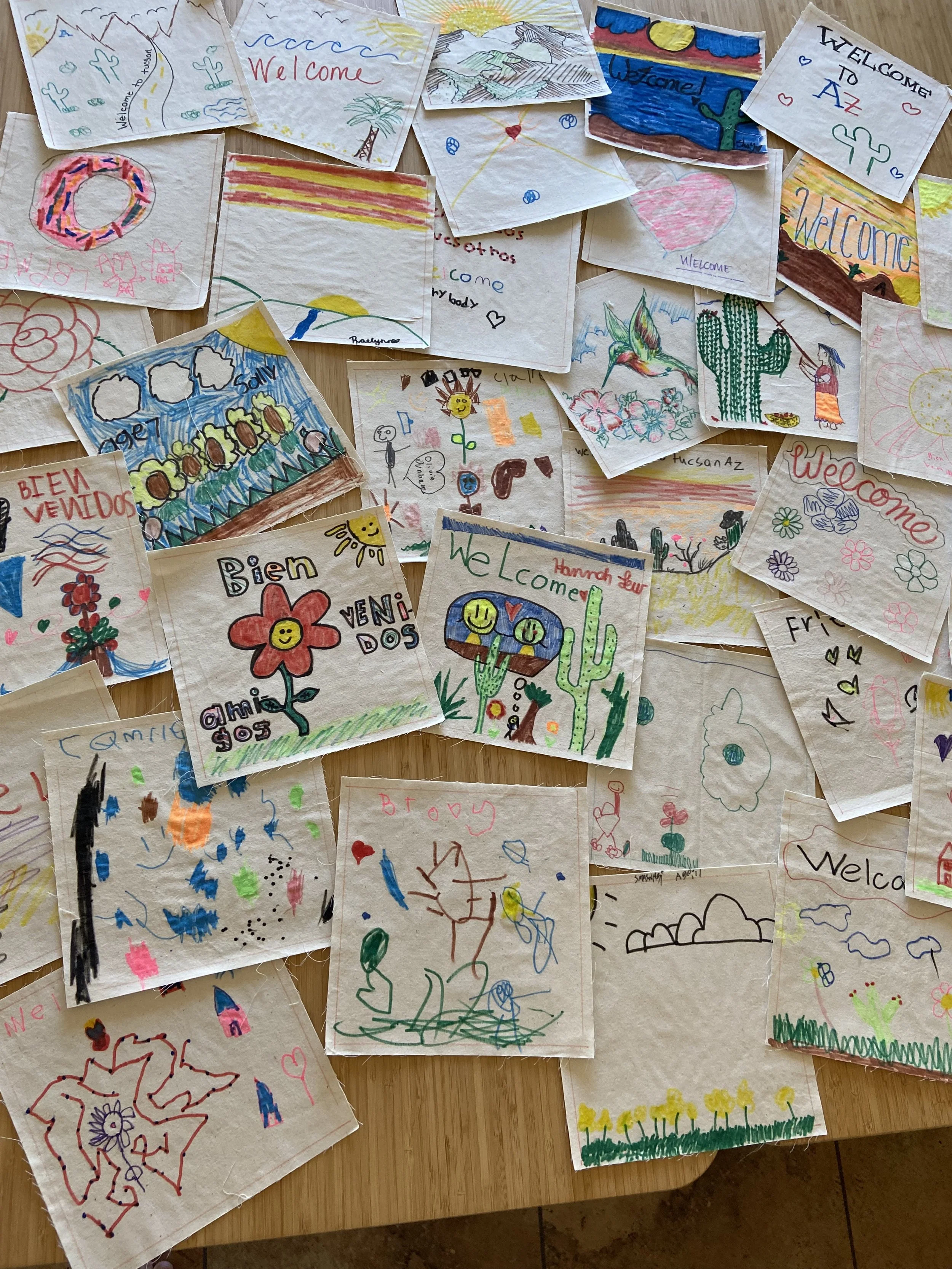 After completing the Welcome Quilts for Patagonia, Gale heard that Episcopal Migration Ministries (EMM), an agency that works with the government to resettle refugees, was forming an Asylum and Detention Network. She joined the education subgroup of the network and began expanding her curriculum into an in-person retreat experience. At the retreat booth at Tucson Meet Yourself (2022), people drew these welcome messages. A Gap store employee even took squares to work, so other employees could participate. Gale continued making Welcome Quilts.